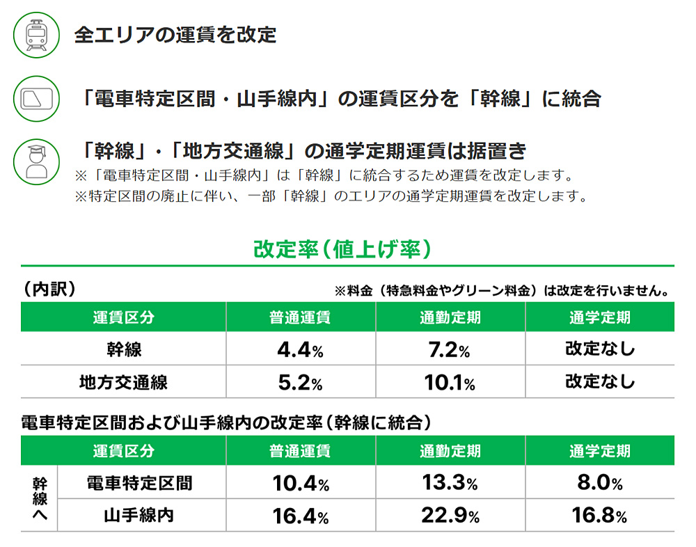 3月14日のダイヤ改正時に行うJR東日本の運賃改定は、「電車特定区間」(山手線以外の旧「国電」区間)と「山手線内」の運賃体系を取り止め、電車特定区間の普通運賃を平均10.4%、山手線内では同16.4%を引き上げるもの。