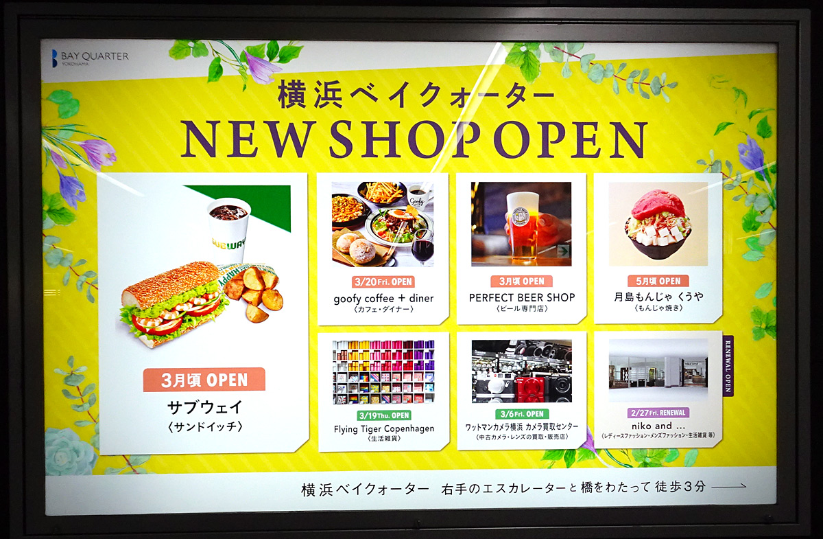 3月6日(金)にオープンする「ワットマンカメラ横浜カメラ買取センター」と、3月26日(木)開店の「サブウェイ」は、2月28日に閉店した駅東口の「マルイシティ横浜」内で営業しており、商業施設の閉店とともに横浜ベイクォーターへ移る形です。