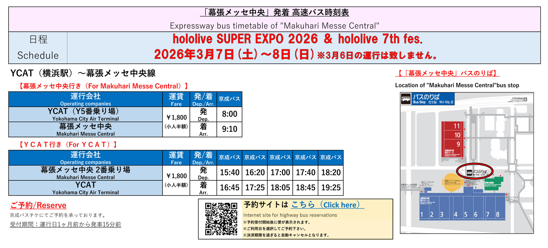 2026年3月6日(金)・7日(土)に「YCAT~幕張メッセ」間で運行される高速バスの時刻表、乗車は予約が優先となるため、予約が無いと乗れない場合もある。なお、羽田空港と幕張メッセ間の高速バスは毎日運行されている(京成バスの公式サイトより)